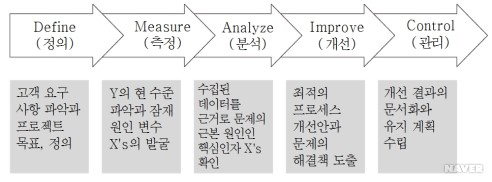 6시그마 프로젝트 수행 방법론은 DMAIC와 DMADOV의 두 가지 유형이 있다. DMAIC는 현재 존재하는 프로세스나 제품의 결함을 획기적으로 개선하기 위한 방법론인 반면, DMADOV는 신제품을 설계하거나 현재 존재하지 않는 새로운 프로세스를 처음부터 6시그마 수준으로 설계하기 위한 방법론이다. 이 중에서 6시그마 프로젝트를 수행하기 위해 가장 일반적으로 사용하는 방법론이 DMAIC 방법론이다. 이 방법론은 <그림 8>에서 볼 수 있듯이, 문제정의(Define), 측정(Measure), 분석(Analyze), 개선(Improve), 관리(Control)의 5단계를 거쳐 혁신 프로세스를 완료한다(노재범 외, 2005; 김계수 외, 2008).
